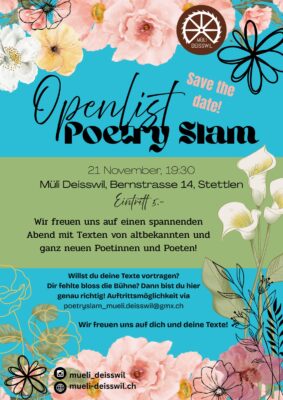 Wir freuen uns beim neuen Openlist-Slam in der Müli Deisswil auf tolle Texten von altbekannten und ganz neuen Poetinnen und Poeten.