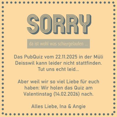 Das PubQuiz Vol. 8 müssen wir wegen einer Doppelbuchung leider absagen.